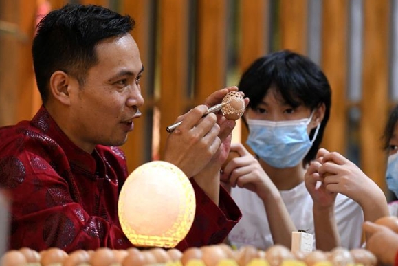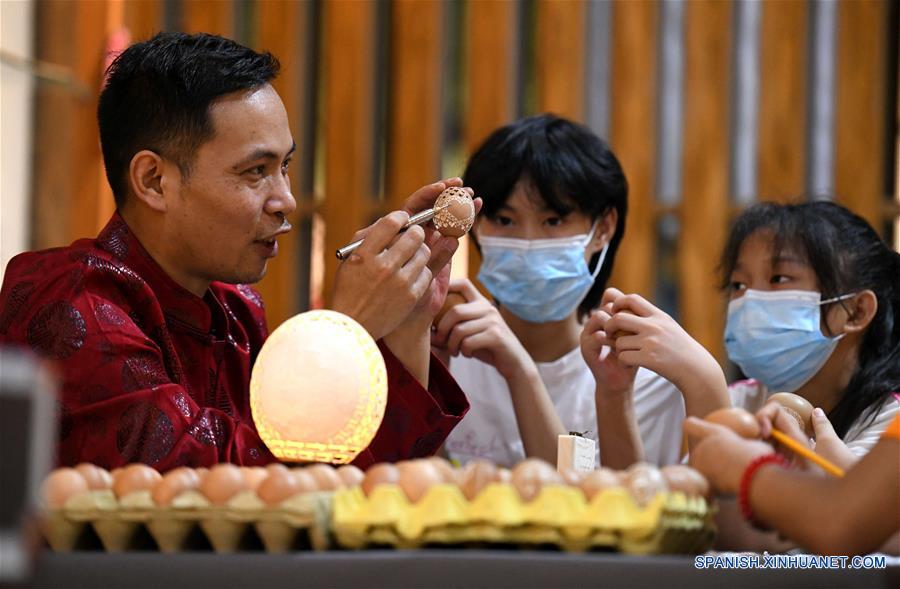 Un artesano enseña a niños a tallar cáscaras de huevo en una zona de industria cultural en el distrito de Qiaoxi de la ciudad de Shijiazhuang, en la provincia de Hebei, en el norte de China, el 10 de agosto de 2020. Qiaoxi ha organizado una serie de actividades para enriquecer las vacaciones de verano de los niños y promover el patrimonio cultural intangible.