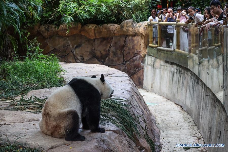 Imagen del 10 de agosto de 2020 de turistas interactuando con el panda gigante Mengmeng en el Parque Safari Chimelong en Guangzhou, provincia de Guangdong, en el sur de China.
