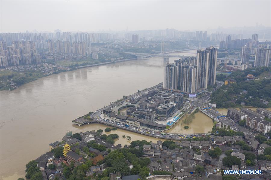 Fotografía aérea del 18 de agosto de 2020 de un área inundada en Ciqikou del distrito de Shapingba, municipio de Chongqing, suroeste de China.