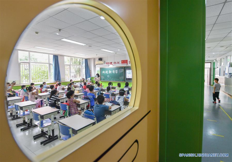 Alumnos de primer grado estudian en un aula en la Escuela Primaria Dongshengshiyan, en el distrito de Haidian, en Beijing, capital de China, el 29 de agosto de 2020. Los estudiantes de las preparatorias, primer y tercer grados de las escuelas secundarias, y primer grado de las escuelas primarias, volvieron el sábado a la escuela en Beijing.
