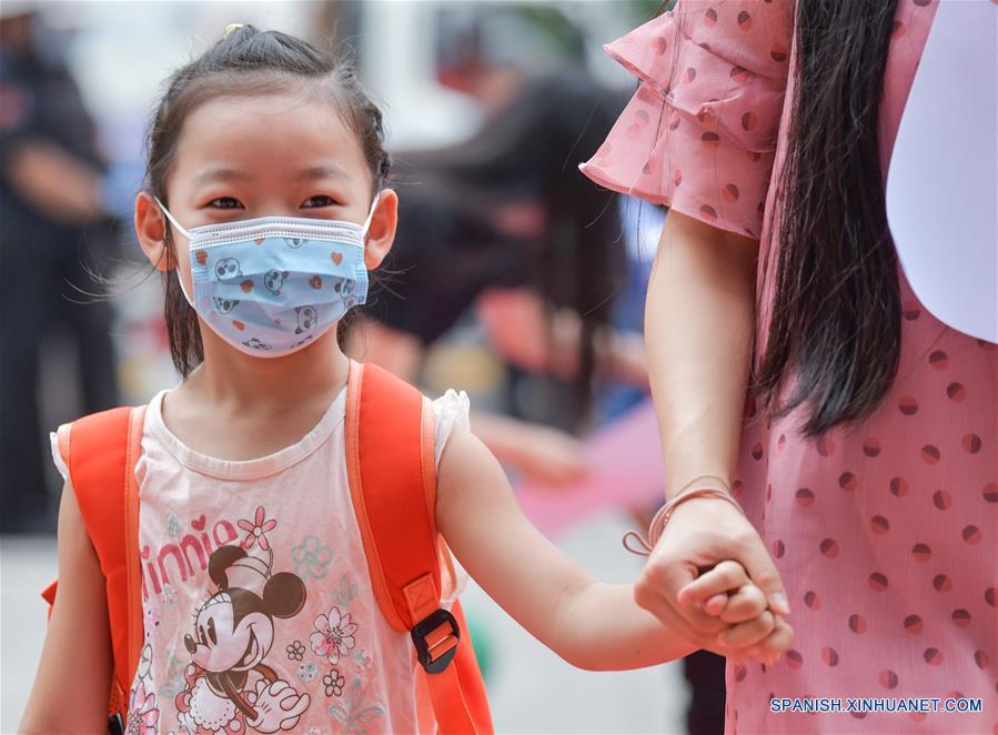 Una profesora lleva a una alumna de primer grado al campus en la Escuela Primaria Dongshengshiyan, en el distrito de Haidian, en Beijing, capital de China, el 29 de agosto de 2020. Los estudiantes de las preparatorias, primer y tercer grados de las escuelas secundarias, y primer grado de las escuelas primarias, volvieron el sábado a la escuela en Beijing.