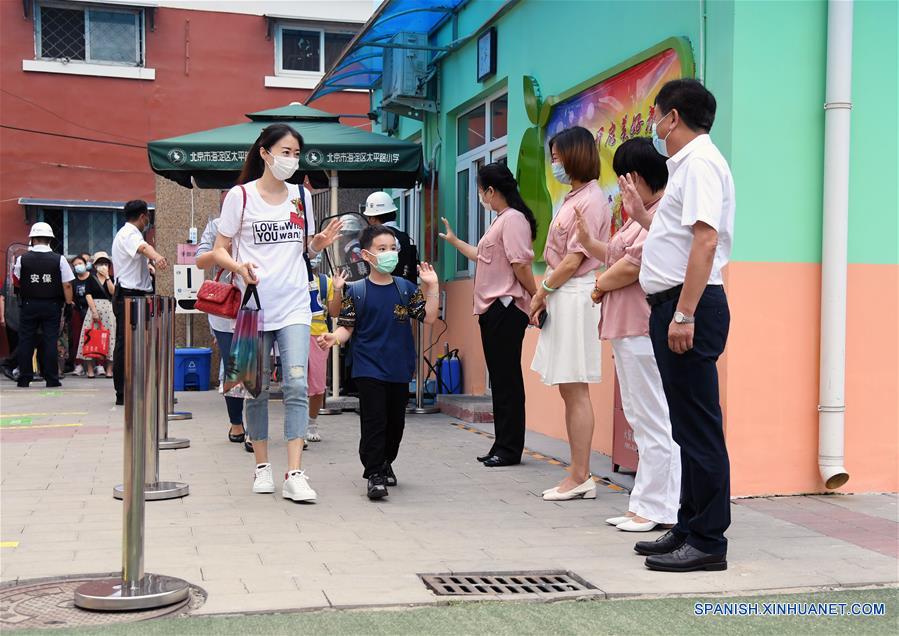 Profesores saludan a un niño de primer grado en la Escuela Primaria Taipinglu, en el distrito de Haidian, en Beijing, capital de China, el 29 de agosto de 2020. Los estudiantes de las preparatorias, primer y tercer grados de las escuelas secundarias, y primer grado de las escuelas primarias, volvieron el sábado a la escuela en Beijing.