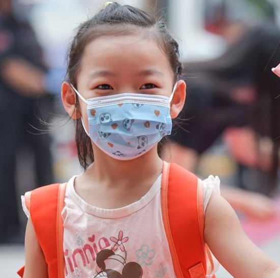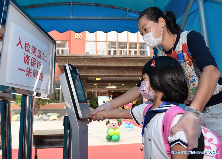 Una niña de primer grado se toma la temperatura con la ayuda de una profesora antes de ingresar al campus de la Escuela Primaria Dongshengshiyan, en el distrito de Haidian, en Beijing, capital de China, el 29 de agosto de 2020. Los estudiantes de las preparatorias, primer y tercer grados de las escuelas secundarias, y primer grado de las escuelas primarias, volvieron el sábado a la escuela en Beijing.