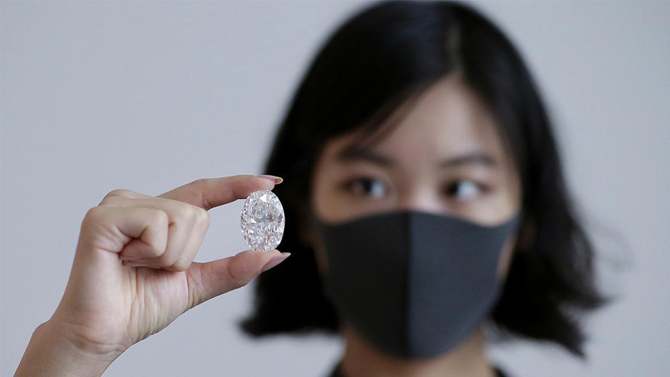 Una empleada de Sotheby's posa con un diamante perfecto de más de 100 quilates, el segundo diamante ovalado más grande de su tipo que haya aparecido en una subasta, el que será pasado por el martillo de Sotheby's en Hong Kong en octubre.
