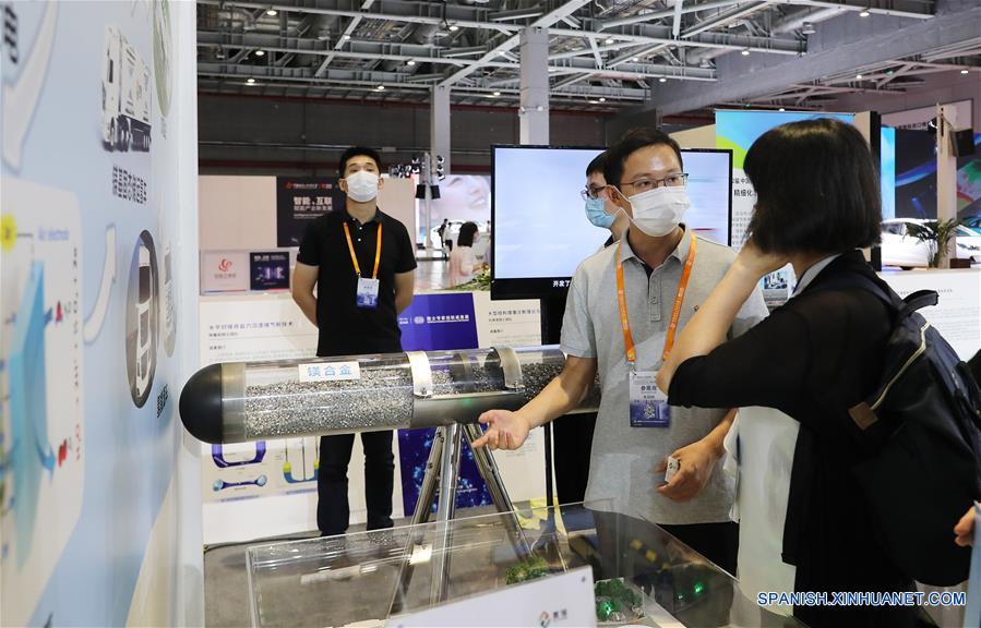 Un empleado (2-d) presenta los resultados de una investigación a una visitante en la Feria Internacional de la Industria de China en Shanghai, en el este de China, el 15 de septiembre de 2020. La XXII Feria Internacional de la Industria de China, que tendrá una duración de cinco días, fue inaugurada el martes en el Centro Nacional de Exposiciones y Convenciones en Shanghai, con la participación de más de 2.000 empresas de 22 países y regiones.