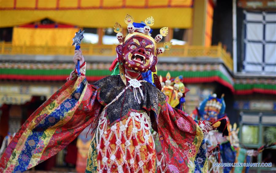 Imagen del 22 de septiembre de 2020 de un monje budista portando una máscara mientras realiza una presentación en un evento anual de danza Cham para orar por una buena cosecha y una vida pacífica en el monasterio Tashilhunpo en Xigaze, en la región autónoma del Tíbet, en el suroeste de China.