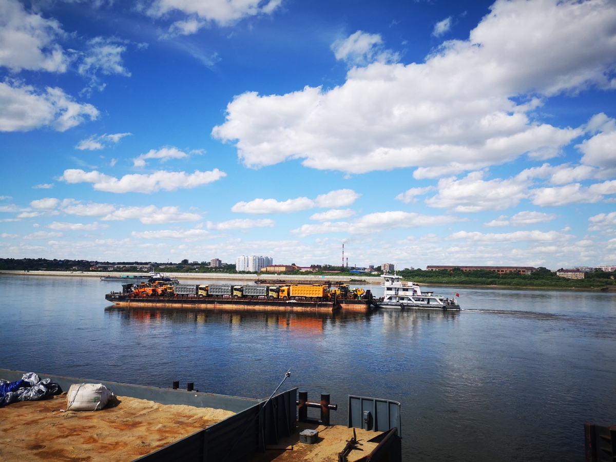 Un carguero navega en la sección Heihe del río Heilong que limita con Rusia el 21 de julio de 2020.