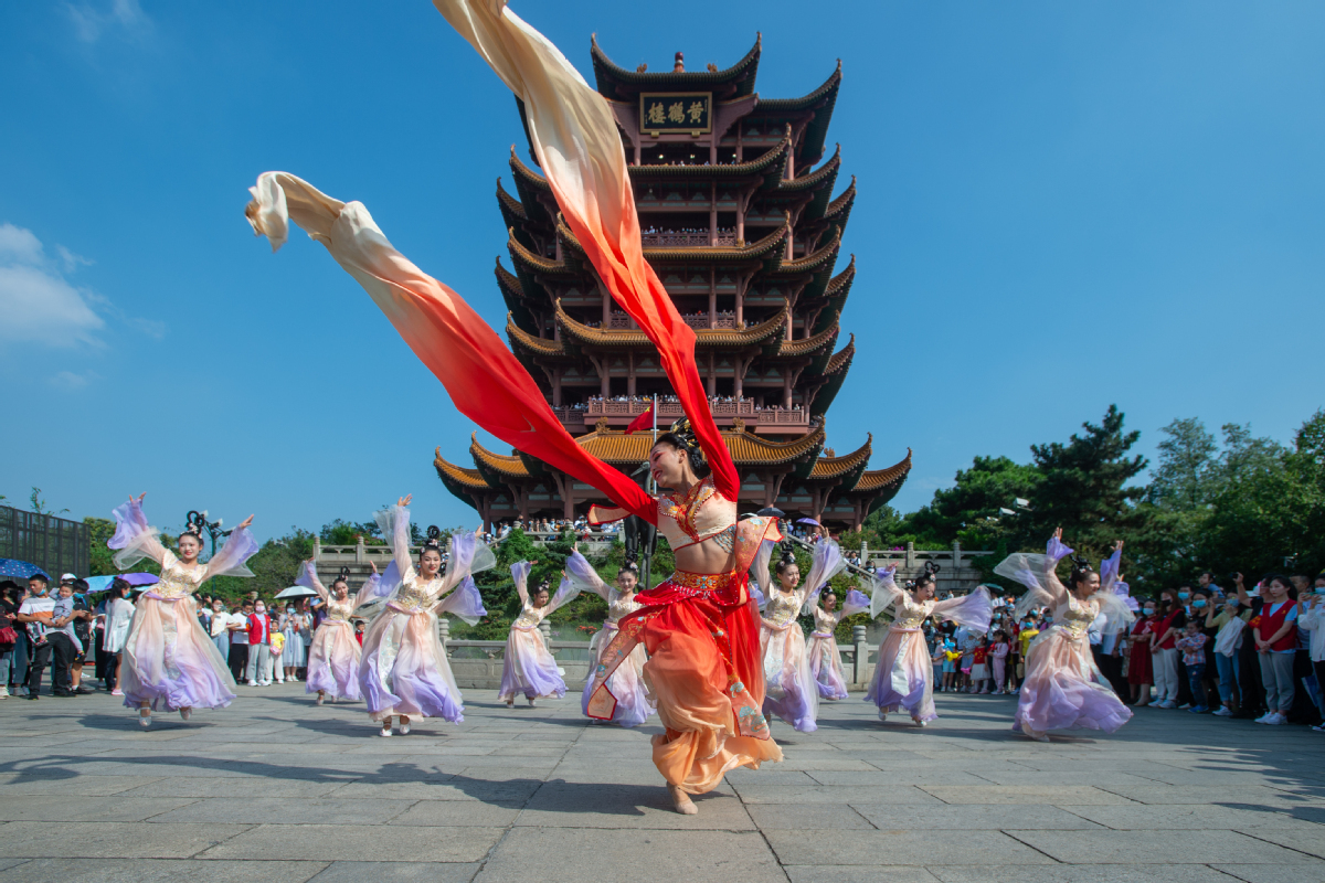 Visitantes disfrutan de un baile frente a la Torre de la Grulla Amarilla en Wuhan, provincia de Hubei, el 1 de octubre de 2020.