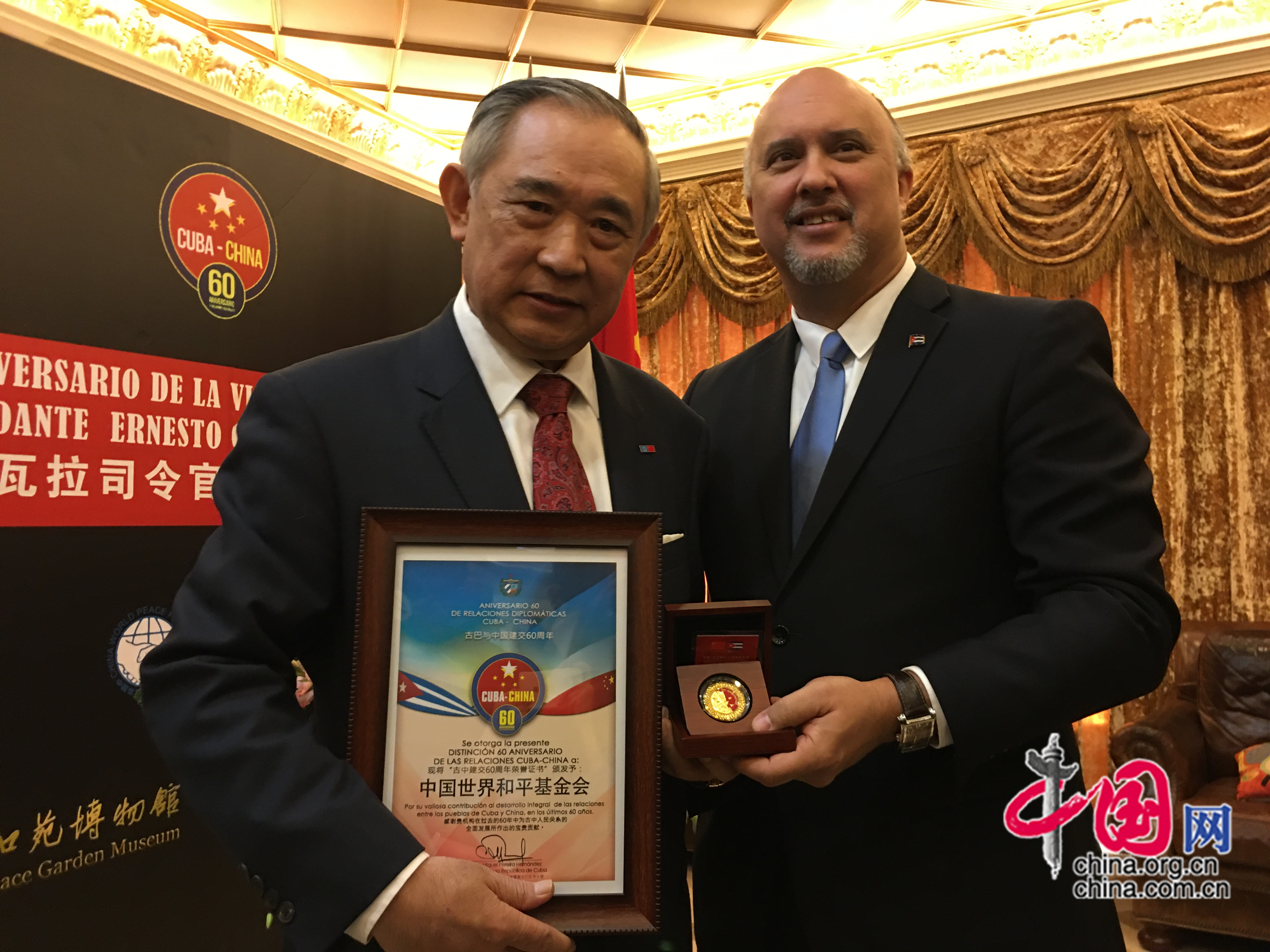El embajador Pereira entrega diploma y medalla por el 60 aniversario del establecimiento de relaciones diplomáticas entre China y Cuba a la Fundación China para la Paz Mundial el 20 de noviembre de 2020.