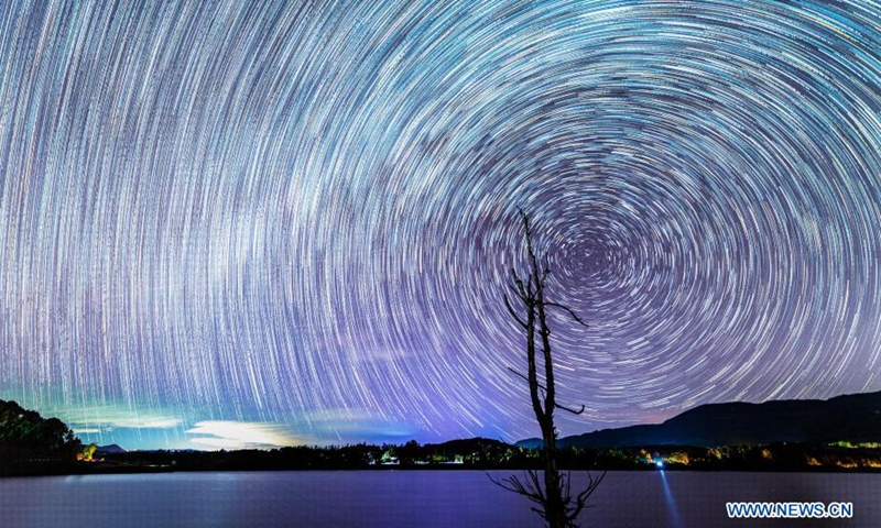 Fotomontaje del 19 de noviembre de 2020 de los rastros de estrellas sobre el lago Nianhu en el condado de Huize de la ciudad de Qujing, provincia de Yunnan, suroeste de China.