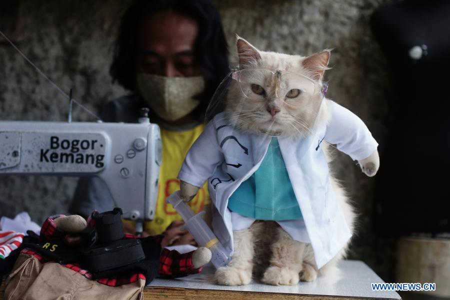Un gato porta un disfraz en un taller de disfraces, en Bogor, provincia de Java Occidental, Indonesia, el 8 de diciembre de 2020. Los productos del taller de disfraces de gatos son vendidos en Internet.