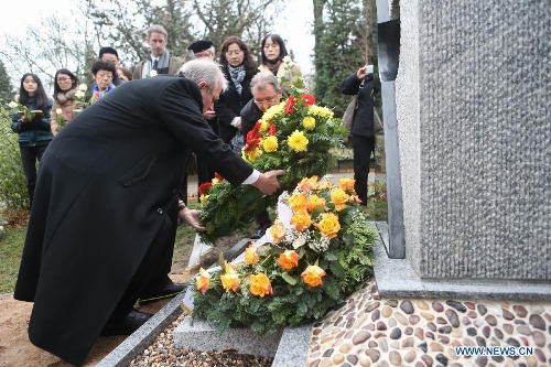El nieto de John Rabe, Thomas Rabe, deposita una ofrenda floral durante la inauguración del Monumento a su abuelo en Berlín, Alemania, el 11 de diciembre de 2013. La apertura del cementerio dedicado al empresario de Siemens John Rabe, quien salvó la vida de cientos de miles de chinos en Nanjing durante la Segunda Guerra Mundial, tuvo lugar en la capital alemana el miércoles.