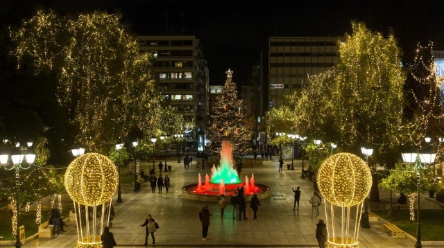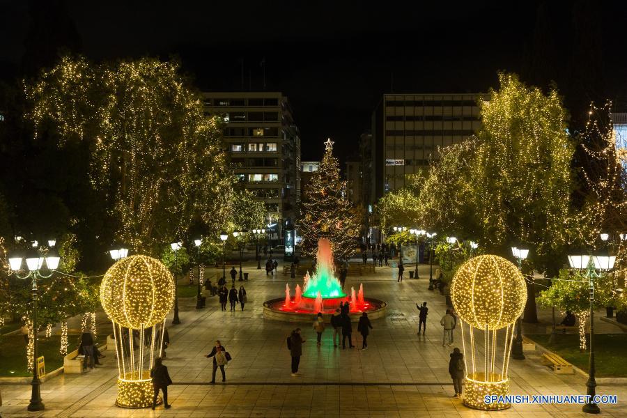 Imagen del 14 de diciembre de 2020 de personas paseando por la plaza Síntagma donde un árbol de Navidad ha sido iluminado para las festividades, en Atenas, Grecia.
