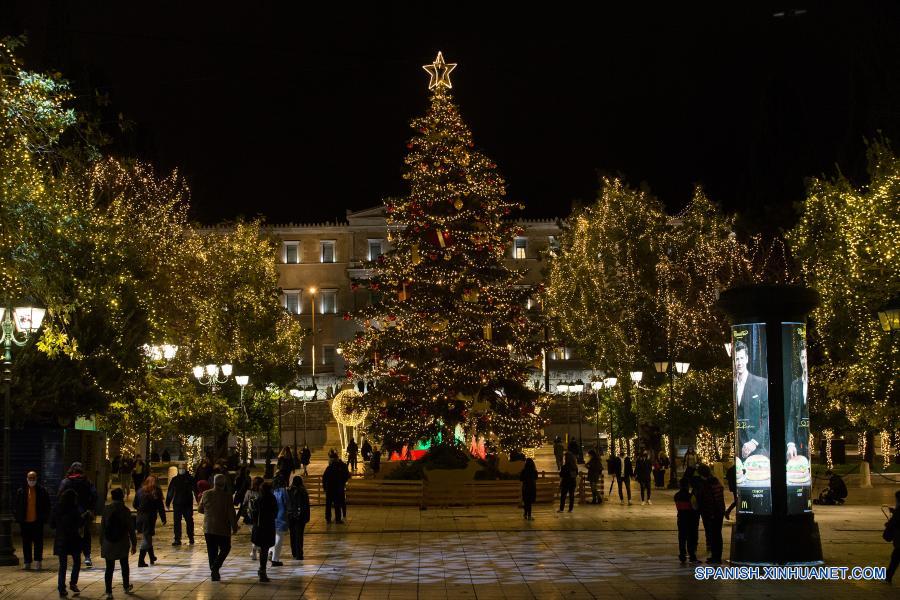 Imagen del 14 de diciembre de 2020 de personas paseando por la plaza Síntagma donde un árbol de Navidad ha sido iluminado para las festividades, en Atenas, Grecia.