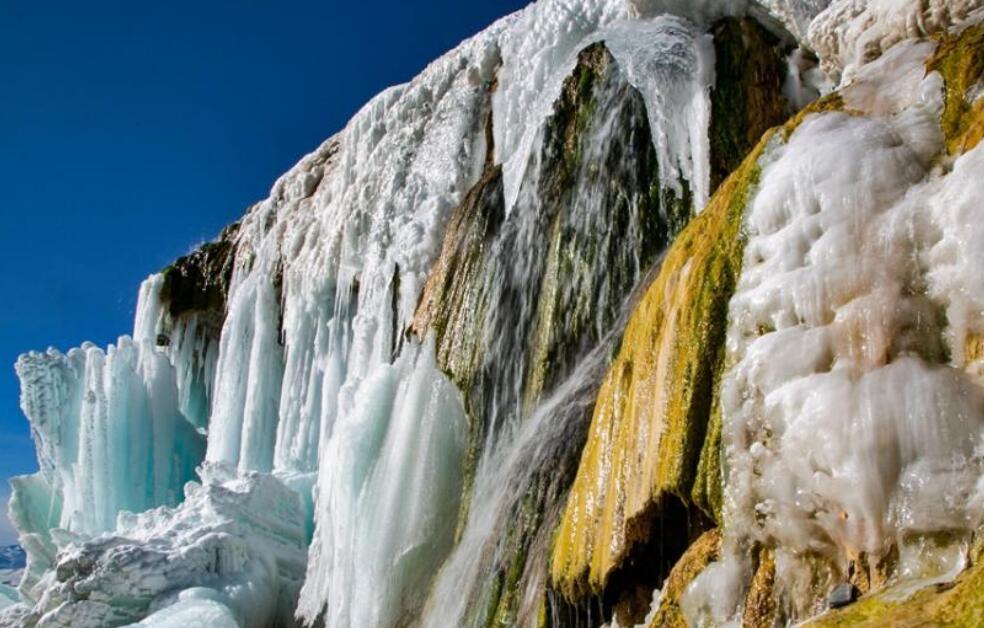 La cascada de hielo al pie del pico Gangshika en el Parque Nacional de la Montaña Qilian, en el cruce de las provincias de Qinghai y Gansu, noroeste de China, revela un colorido paisaje bajo el sol el23 de enero de 2021.