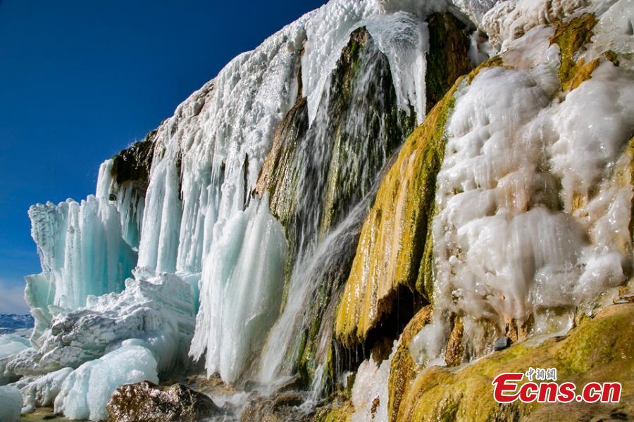 La cascada de hielo revela un colorido paisaje bajo el sol dada la presencia de una variedad de minerales en el arroyo.