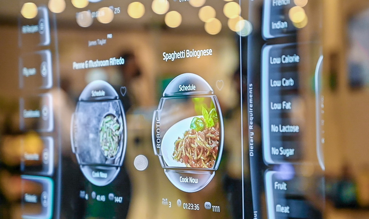 Menú digital en la exhibición de Moley Kitchen en el Consumer Electronics Show 2021 en Las Vegas.