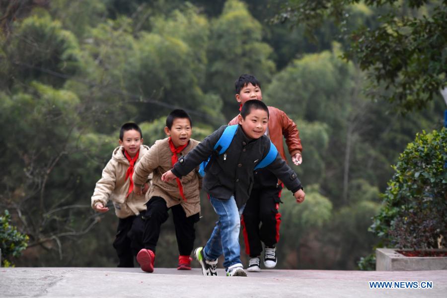 Estudiantes corren hacia la entrada de la escuela primaria del grupo étnico She de Xijin, condado de Zhenghe, provincia de Fujian, en el sureste de China, el 1 de marzo de 2021. El lunes inició un nuevo semestre en el colegio del grupo étnico She de Xijin. El único internado para estudiantes de nivel primaria en el condado de Zhenghe, la escuela es un "hogar lejos del hogar" para sus 167 alumnos, casi la mitad de ellos, niños abandonados. La idea surgió de un colegio ordinario establecido en 1979 y devino internado tras un proceso de reconstrucción gradual gracias a financiación pública y privada. Su director Zhuang Guigan, y su esposa, Liang Chun Ai, trabajan como niñeras de 83 escolares que viven en el campus. Ellos están a su lado en cada momento de su vida diaria, desde las visitas matutinas, los desayunos, las clases, hasta la hora de dormir.