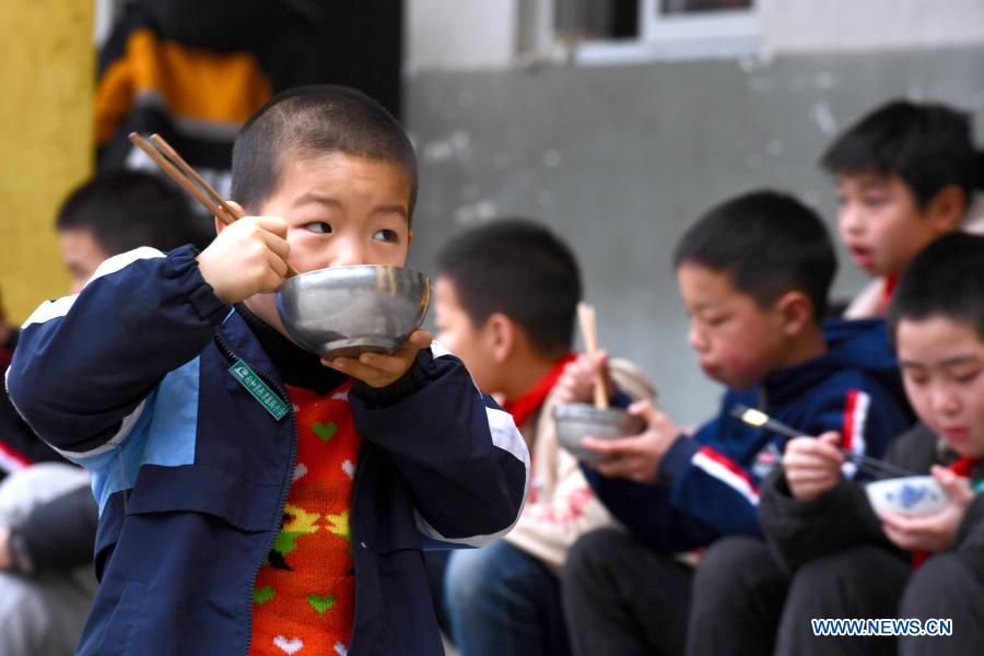Los niños desayunan en la escuela primaria del grupo étnico She de Xijin, condado de Zhenghe, provincia de Fujian, en el sureste de China, el 1 de marzo de 2021. El lunes inició un nuevo semestre en el colegio del grupo étnico She de Xijin. El único internado para estudiantes de nivel primaria en el condado de Zhenghe, la escuela es un "hogar lejos del hogar" para sus 167 alumnos, casi la mitad de ellos, niños abandonados. La idea surgió de un colegio ordinario establecido en 1979 y devino internado tras un proceso de reconstrucción gradual gracias a financiación pública y privada. Su director Zhuang Guigan, y su esposa, Liang Chun Ai, trabajan como niñeras de 83 escolares que viven en el campus. Ellos están a su lado en cada momento de su vida diaria, desde las visitas matutinas, los desayunos, las clases, hasta la hora de dormir.