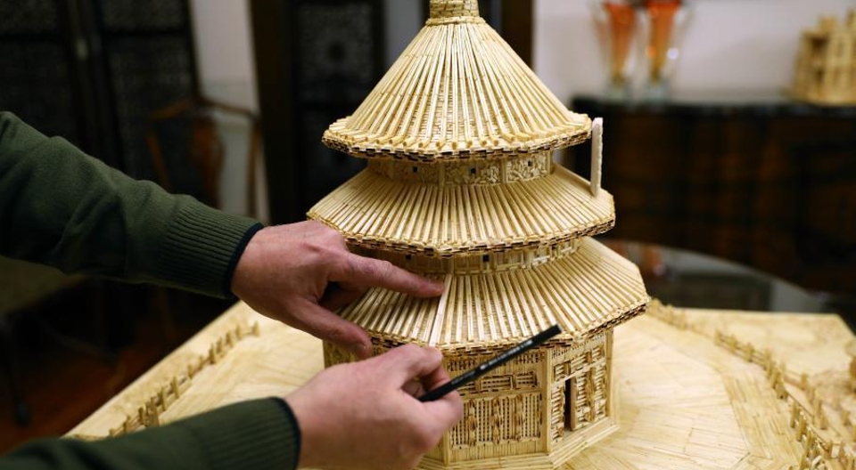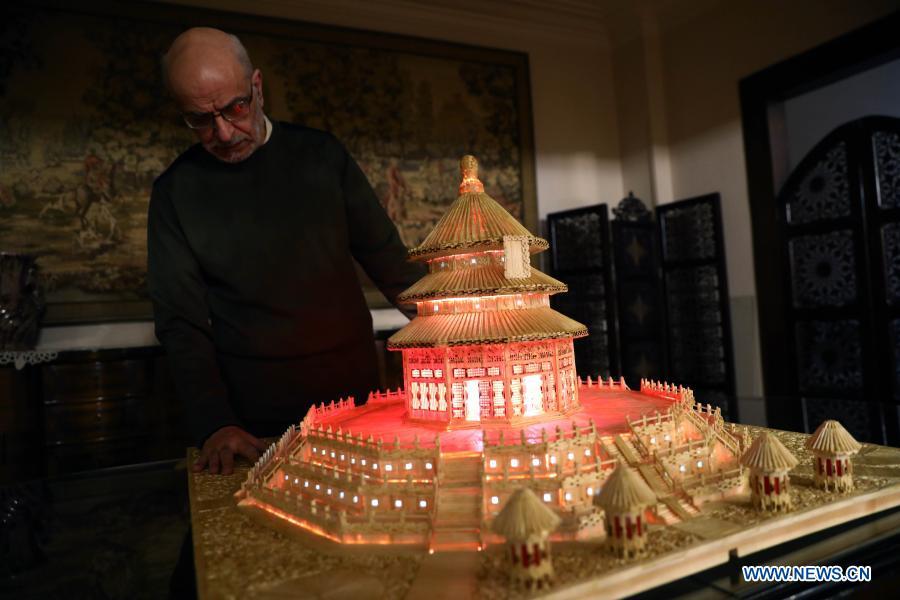 Ahmed Hassan muestra una réplica miniatura del Templo del Cielo hecho con palitos de fósforo en El Cairo, Egipto, el 26 de febrero de 2021.