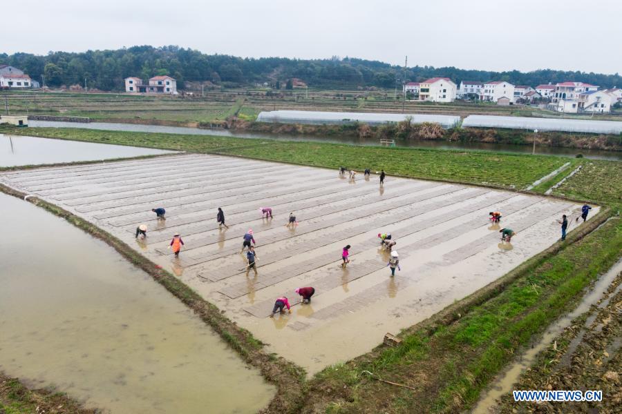 Vista aérea de agricultores preparando el terreno para el cultivo mecánico de arroz en la aldea de Yanglinjie, provincia de Hunan, en el centro de China, 16 de marzo de 2021. En Yanglinjie, los campesinos no pierden el tiempo y dejan todo listo para la plantación mecánica de arroz, una técnica que gana popularidad en el condado de Yueyang.
