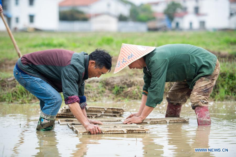 Los agricultores preparan el terreno para el cultivo mecánico de arroz en la aldea de Yanglinjie, provincia de Hunan, en el centro de China, 16 de marzo de 2021. En Yanglinjie, los campesinos no pierden el tiempo y dejan todo listo para la plantación mecánica de arroz, una técnica que gana popularidad en el condado de Yueyang.