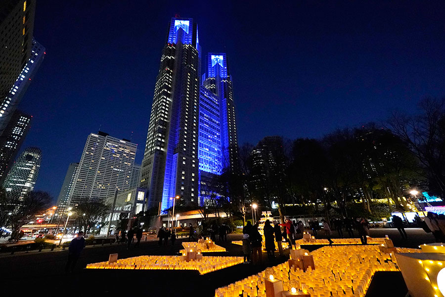 Velas iluminadas por Navidad frente al edificio de oficinas del gobierno metropolitano de Tokio, en Tokio, Japón, 25 de diciembre de 2020.