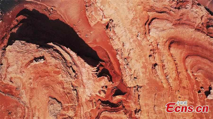 Formación rocosa de incomparable color rojo al pie de Tianshan, condado de Toksun, Región Autónoma Uygur de Xinjiang, China, 23 de marzo de 2021. Las formaciones rocosas de Yardang son el resultado de la erosión del viento y se pueden encontrar en áreas secas en la forma de crestas y surcos.