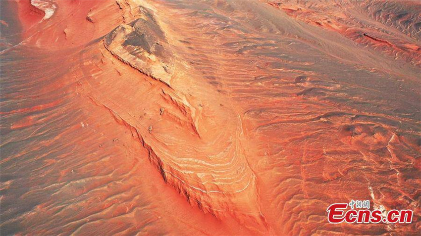 Formación rocosa de incomparable color rojo al pie de Tianshan, condado de Toksun, Región Autónoma Uygur de Xinjiang, China, 23 de marzo de 2021. Las formaciones rocosas de Yardang son el resultado de la erosión del viento y se pueden encontrar en áreas secas en la forma de crestas y surcos.