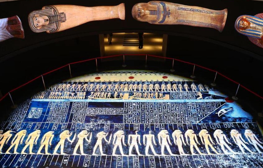 Personas visitan la Sala de las Momias Reales en el Museo Nacional de la Civilización Egipcia (NMEC, por sus siglas en ingles), en El Cairo, Egipto, el 18 de abril de 2021. La Sala de las Momias Reales del NMEC abrió al público el domingo. La Sala de las Momias está especialmente diseñada para mostrar a las momias pertenecientes a reyes y reinas de las dinastías XVII, XVIII, XIX y XX que gobernaron el antiguo Egipto hace más de 3.000 años. (Xinhua/Sui Xiankai)