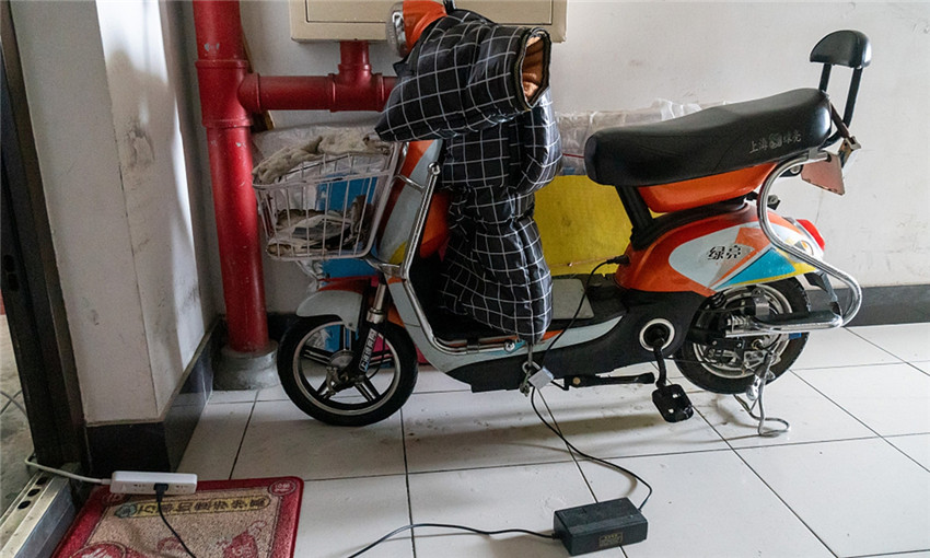 Carga de una moto eléctrica en un edificio residencial en Shanghai el 28 de febrero de 2021