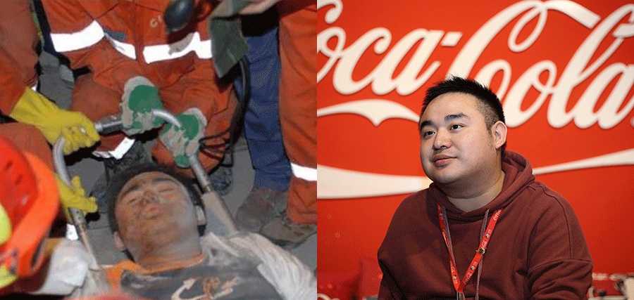 Izquierda: una captura de pantalla en la que aparece Xue Xiao saliendo de los escombros. Derecha: Xue ahora trabaja para Cofco Coca-Cola Beverage (Sichuan) Co Ltd.