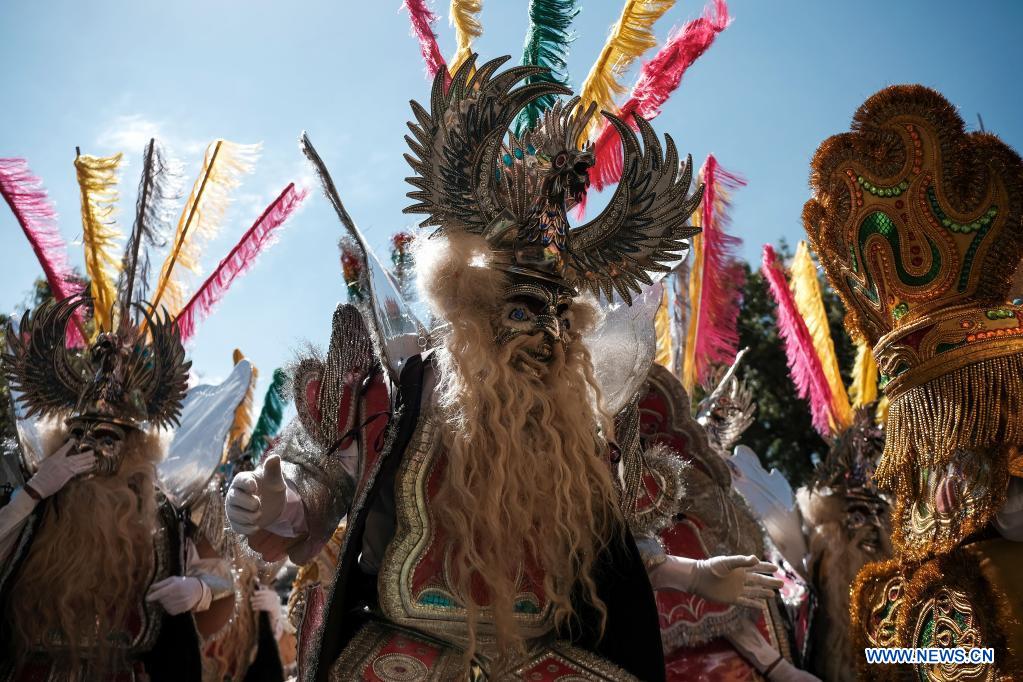 Hombres portan vestimenta tradicional mientras bailan la danza de la "Morenada" durante el acto de reivindicación de las danzas bolivianas denominado "Matracas y cascabeles reviven sus raíces", en la plaza Murillo, en La Paz, Bolivia, el 18 de mayo de 2021.