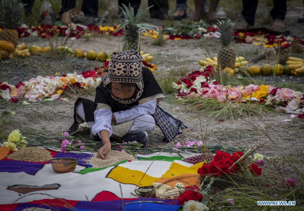 Un niño participa en el Inti Raymi o Fiesta del Sol que marca el inicio del solsticio de invierno, fecha del día más corto y de la noche más larga del año, en el sitio arqueológico Pucará de Rumicucho, en Quito, capital de Ecuador, el 21 de junio de 2021.