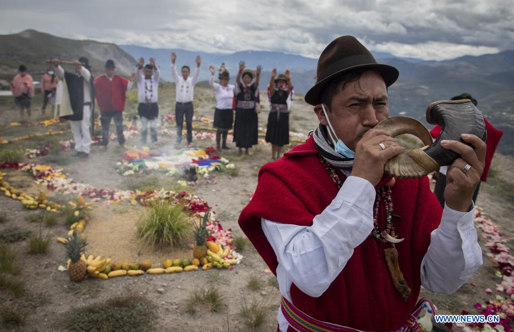 Indígenas participan en el Inti Raymi o Fiesta del Sol que marca el inicio del solsticio de invierno, fecha del día más corto y de la noche más larga del año, en el sitio arqueológico Pucará de Rumicucho, en Quito, capital de Ecuador, el 21 de junio de 2021.