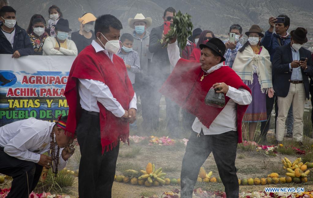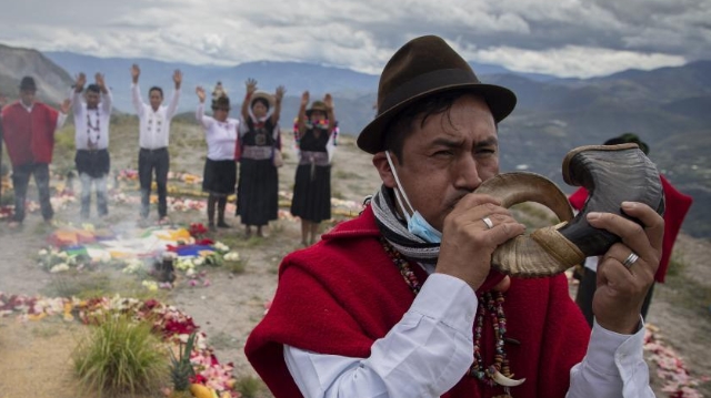 Indígenas participan en el Inti Raymi o Fiesta del Sol que marca el inicio del solsticio de invierno, fecha del día más corto y de la noche más larga del año, en el sitio arqueológico Pucará de Rumicucho, en Quito, capital de Ecuador, el 21 de junio de 2021.