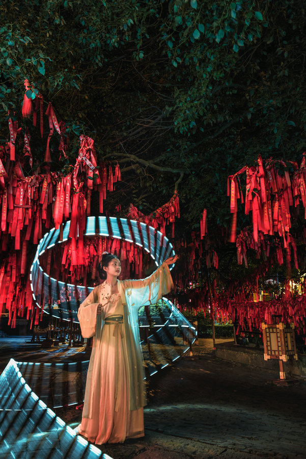 Las fotografías muestran el paisaje natural local y la arquitectura histórica, modelos luciendo trajes tradicionales chinos y rayas de luz que muestran los contornos de criaturas mitológicas y agregan una sensación de misterio.