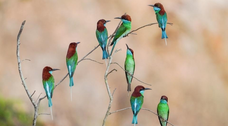 Los abejarucos de garganta azul, un ave raramente vista en China, son fotografiados en el condado de Wuping, provincia de Fujian.