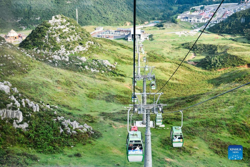 Turistas observan el paisaje en teleférico en un lugar pintoresco en el condado de Hezhang, provincia de Guizhou, suroeste de China, 3 de septiembre de 2021.
