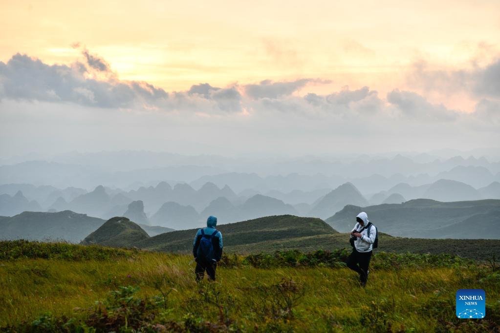 Turistas admiran el amanecer en un lugar pintoresco en el condado de Hezhang, provincia de Guizhou, suroeste de China, 4 de septiembre de 2021.