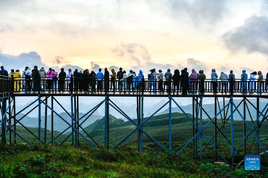 Turistas admiran el amanecer en un lugar pintoresco en el condado de Hezhang, provincia de Guizhou, suroeste de China, 4 de septiembre de 2021.