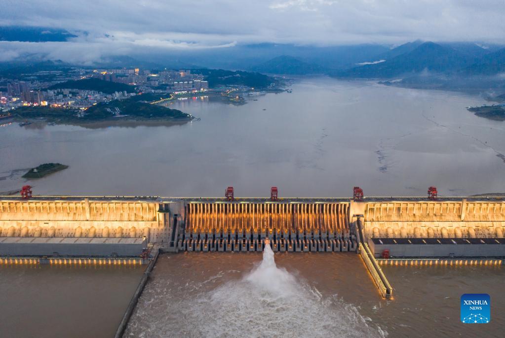 Fotografía del 6 de septiembre de 2021 de la presa de las Tres Gargantas en la provincia de Hubei, en el centro de China. Las autoridades chinas han adoptado medidas rigurosas contra las inundaciones a lo largo del río Yangtsé, a medida que los niveles de agua continúan aumentando después de las fuertes lluvias, indicó el lunes el Ministerio de Recursos Hídricos. El flujo de agua en el embalse de las Tres Gargantas ha aumentado rápidamente, alcanzando los 54.000 metros cúbicos por segundo a las 2 p.m. del lunes. El ministerio anunció que está manteniendo su respuesta en el Nivel IV y ha pedido más medidas contra las inundaciones en el embalse de las Tres Gargantas y otros proyectos principales a lo largo del río. China tiene un sistema de respuesta a emergencias de control de inundaciones de cuatro niveles, siendo el nivel I el más severo.