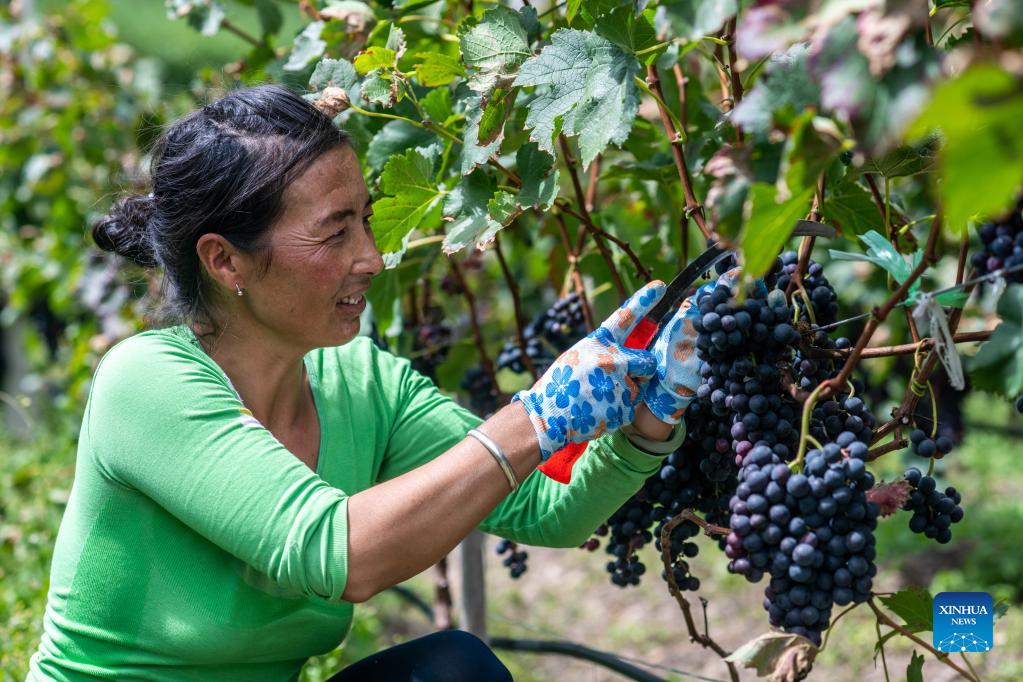 Una mujer cosecha uvas en el condado de Deqin, provincia de Yunnan, suroeste de China, 14 de septiembre de 2021. La industria de las uvas ha ayudado a promover el desarrollo rural y aumentar los ingresos de los lugareños.