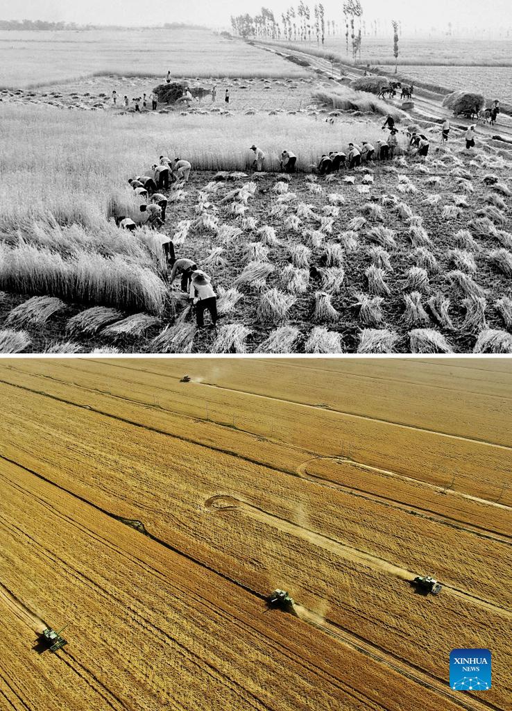 Foto combinada en la que aparecen los agricultores cosechando trigo con hoces en el condado de Yanshi en la década de 1950 y los segadores cosechando trigo en la ciudad de Zhoukou, 6 de junio de 2021, provincia de Henan, centro de China. Henan es una provincia importante para la producción agrícola en China. Desde la fundación de la República Popular China en 1949, especialmente durante los más de 40 años de reforma y apertura, la agricultura mecanizada y de alta tecnología ha ayudado a mejorar la calidad y la eficiencia de los negocios agrícolas allí. Hasta la fecha, un número creciente de agricultores están adoptando equipos agrícolas avanzados y procesos de gestión, despidiéndose de los arduos medios tradicionales de operación agrícola.