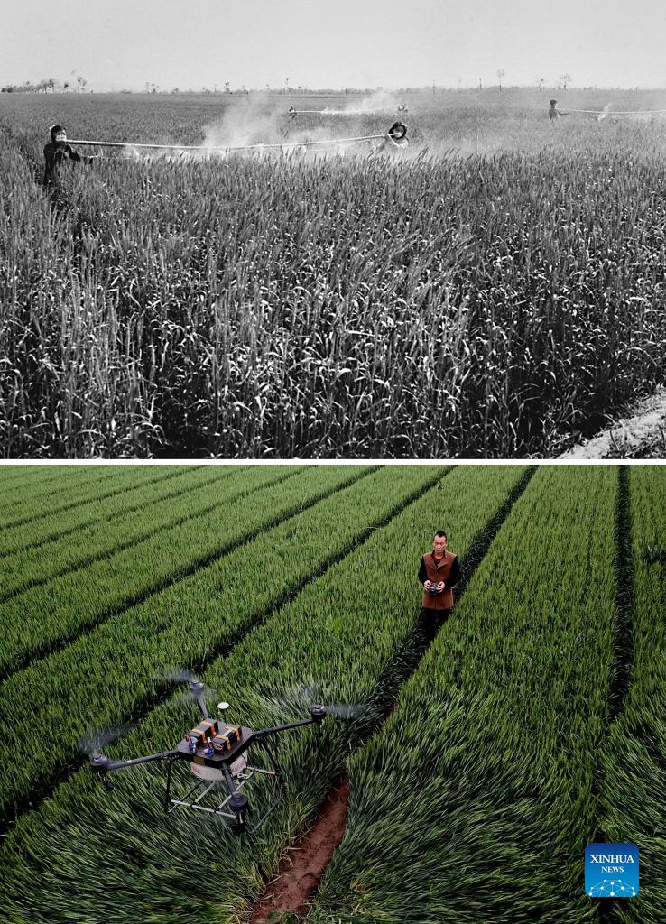 Foto combinada de personas aplicando pesticidas con un dispositivo simple hecho a mano en el suburbio de la ciudad de Luoyang en la década de 1950, y un miembro del personal operando un dron para rociar pesticidas en Wude del condado de Wenxian, 25 de abril de 2018, provincia de Henan, centro de China.