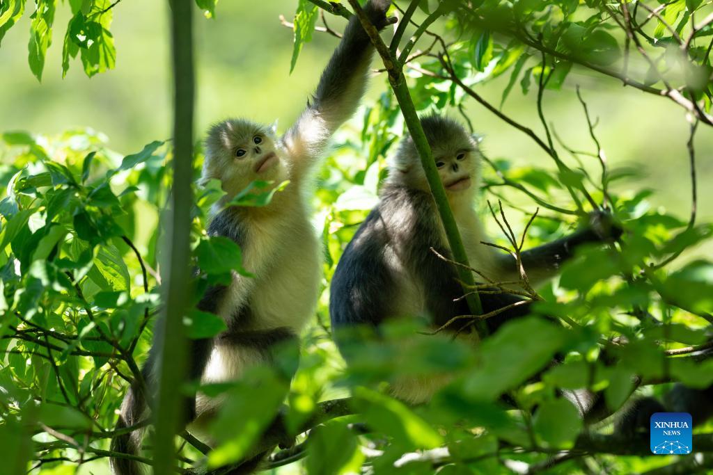Monos de nariz chata en el Parque Nacional de los monos de nariz chata de Yunnan en Shangri-La, Prefectura Autónoma Tibetana de Deqen, provincia de Yunnan, suroeste de China, 19 de julio de 2021. El mono blanco y negro de nariz chata, también conocido como el mono dorado de Yunnan, es un animal bajo protección de primera clase nacional en China. La especie también está en la Lista Roja de la Unión Internacional para la Conservación de la Naturaleza y los Recursos Naturales (UICN). Alrededor de la década de 1980, la caza y la tala habían dañado gravemente los hábitats de los monos, lo que suponía una amenaza para su supervivencia. En 1983, la provincia de Yunnan estableció la Reserva Natural Nacional Baima Snow Mountain para salvar a los monos en peligro de extinción. Para que los monos se sintieran "como en casa", los residentes cercanos también se movilizaron para participar en la conservación. Gracias a los esfuerzos conjuntos del gobierno, los investigadores y los aldeanos locales, el número de monos dorados de Yunnan ha aumentado de no más de 1.500 a más de 3.300.