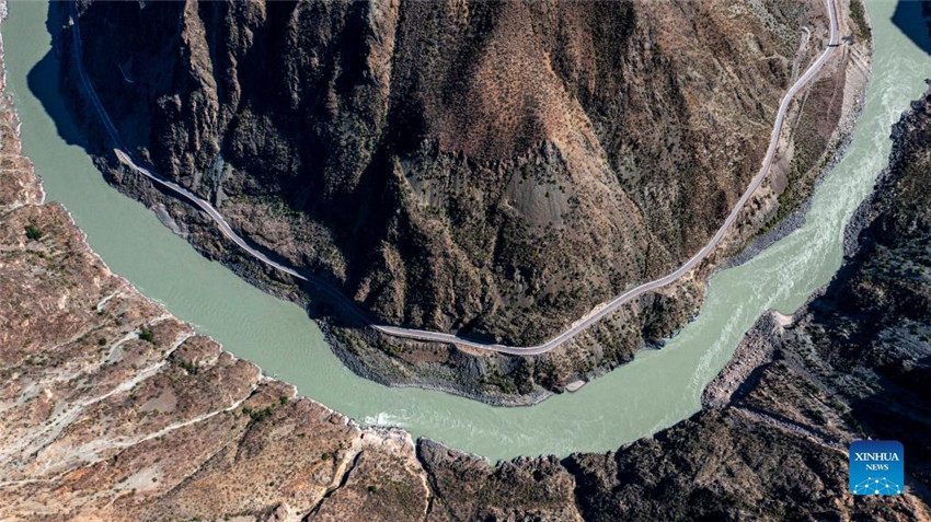 Fotografía aérea del 27 de octubre de 2021 del sinuoso río Jinsha, la sección superior del río Yangtsé, suroeste de China.