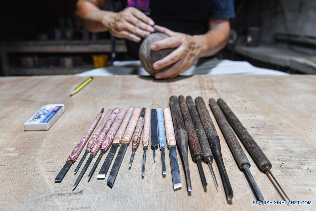 Imagen del 14 de septiembre de 2021 de las herramientas usadas para tallar el coco en el estudio de Ke Qiufeng, en la aldea de Ruchuan de Haikou, provincia de Hainan, en el sur de China. El tallado de coco, uno de los patrimonios culturales inmateriales de China, tiene una historia de miles de años en la provincia de Hainan. Hecho de cáscara de coco, madera y palma como material, un buen trabajo de tallado de coco debe pasar por procedimientos complicados y requiere habilidades refinadas y gran paciencia de un artesano. Ke Qiufeng, de 51 años de edad, lleva dedicándose a tallar cocos desde 1994, cuando comenzó a aprender esta habilidad en una fábrica. "Me enamoré de él a primera vista", dijo. Para Ke, no importa si está haciendo un cuadro decorativo, un jarrón delicado o simplemente un cuenco que las personas usarían a diario, es una obra de arte. "Hay que estar muy concentrado cuando estás tallando, o te lastimarás con el cuchillo", dijo Ke. Tras años de duro trabajo, Ke ha sido seleccionado como heredero representativo del tallado de coco de Hainan a nivel provincial. Además de hacer tallas de coco él mismo, Ke también da conferencias a los estudiantes del Instituto de Formación Profesional y Técnica de Hainan cada semana. Al ver que cada vez menos personas quisieran dedicarse a esta habilidad tradicional, Ke Qiufeng está más preocupado que nadie. "La habilidad de tallar cocos se ha heredado durante miles de años. Sería una pena que se perdiera en nuestra generación. Por eso necesito mantenerla viva", dijo.