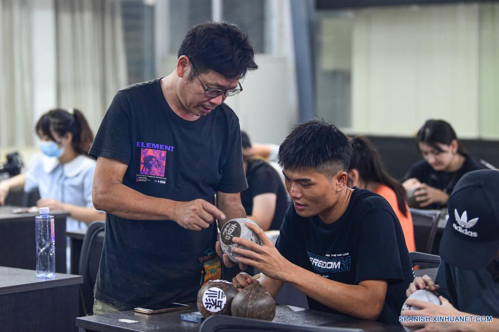 Imagen del 20 de octubre de 2021 de Ke Qiufeng enseñando en una clase de tallado de coco en la Universidad Normal de Hainan, en la aldea de Ruchuan de Haikou, provincia de Hainan, en el sur de China. El tallado de coco, uno de los patrimonios culturales inmateriales de China, tiene una historia de miles de años en la provincia de Hainan. Hecho de cáscara de coco, madera y palma como material, un buen trabajo de tallado de coco debe pasar por procedimientos complicados y requiere habilidades refinadas y gran paciencia de un artesano. Ke Qiufeng, de 51 años de edad, lleva dedicándose a tallar cocos desde 1994, cuando comenzó a aprender esta habilidad en una fábrica. "Me enamoré de él a primera vista", dijo. Para Ke, no importa si está haciendo un cuadro decorativo, un jarrón delicado o simplemente un cuenco que las personas usarían a diario, es una obra de arte. "Hay que estar muy concentrado cuando estás tallando, o te lastimarás con el cuchillo", dijo Ke. Tras años de duro trabajo, Ke ha sido seleccionado como heredero representativo del tallado de coco de Hainan a nivel provincial. Además de hacer tallas de coco él mismo, Ke también da conferencias a los estudiantes del Instituto de Formación Profesional y Técnica de Hainan cada semana. Al ver que cada vez menos personas quisieran dedicarse a esta habilidad tradicional, Ke Qiufeng está más preocupado que nadie. "La habilidad de tallar cocos se ha heredado durante miles de años. Sería una pena que se perdiera en nuestra generación. Por eso necesito mantenerla viva", dijo.