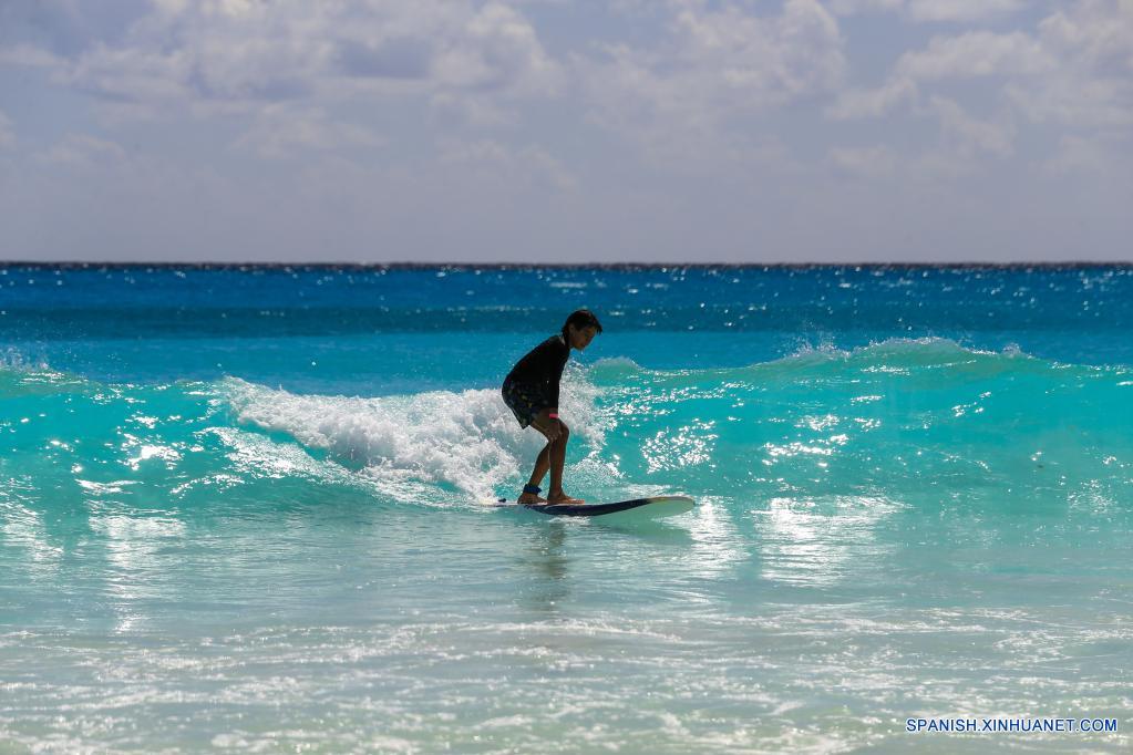 Una persona surfea en la playa Gaviota Azul, en Cancún, estado de Quintana Roo, México, el 6 de noviembre de 2021. (Xinhua/Fito Valdéz)